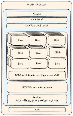 - a data section: blobs storing the archive structure, metadata and data: content-addressed, deduplicated, compressed and encrypted. This section has an index of MAC for all its blobs to provide integrity checking at blob level.